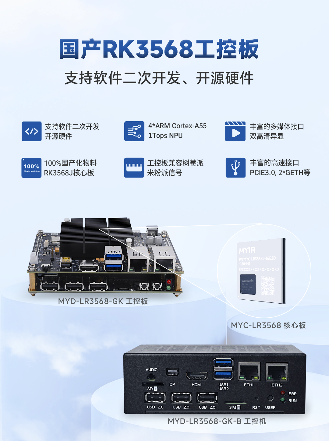 国产之星-瑞芯微RK3568一直备受关注,米尔电子推广的RK3568核心板采用创新LGA设计,核心板质量更可靠,成本更优。除米粉派RK3568(MYD-LR3568开发板)之外,米尔加推MYD-LR3568-GK工控板和MYD-LR3568-GK-B工控机,丰富更多的应用场景。MYD-LR3568-GK工控板基于MYC-LR3568工业级核心板设计,搭载4核ARM Cortex-A55架构的高性能处理器,适用于工业现场应用需求。搭载了两路千兆以太网接口、板载WIFI+BT模块、HDMI+miniDP+MIPIDSI+LVDS四种显示接口、1路3.5mm音频接口、1路USB3.0 HOST 、1路 USB2.0 OTG接口、1路Micro SD接口、1路兼容树莓派40pin扩展接口、1路米尔自定义40pin扩展接口。