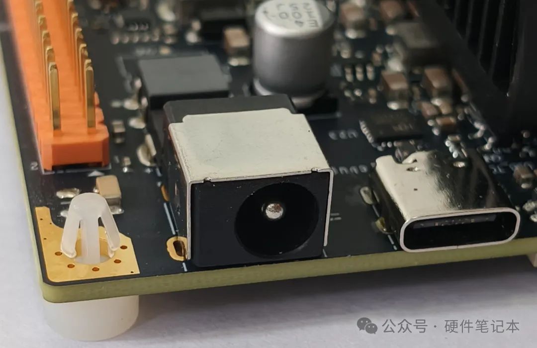 下面进行细节展示:DC JACK 5.5-2.1DC,通用型号,可以兼容市面上大多数电源适配器。旁边是通用的type-C接口,用于DEBUG调试。
