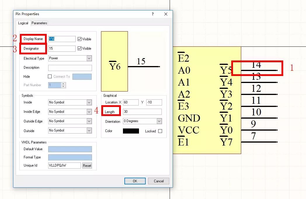 5-在图纸上双击引脚,弹出引脚参数设置窗口,2为引脚名称设置,3为引脚编号设置,4为引脚长度设置。