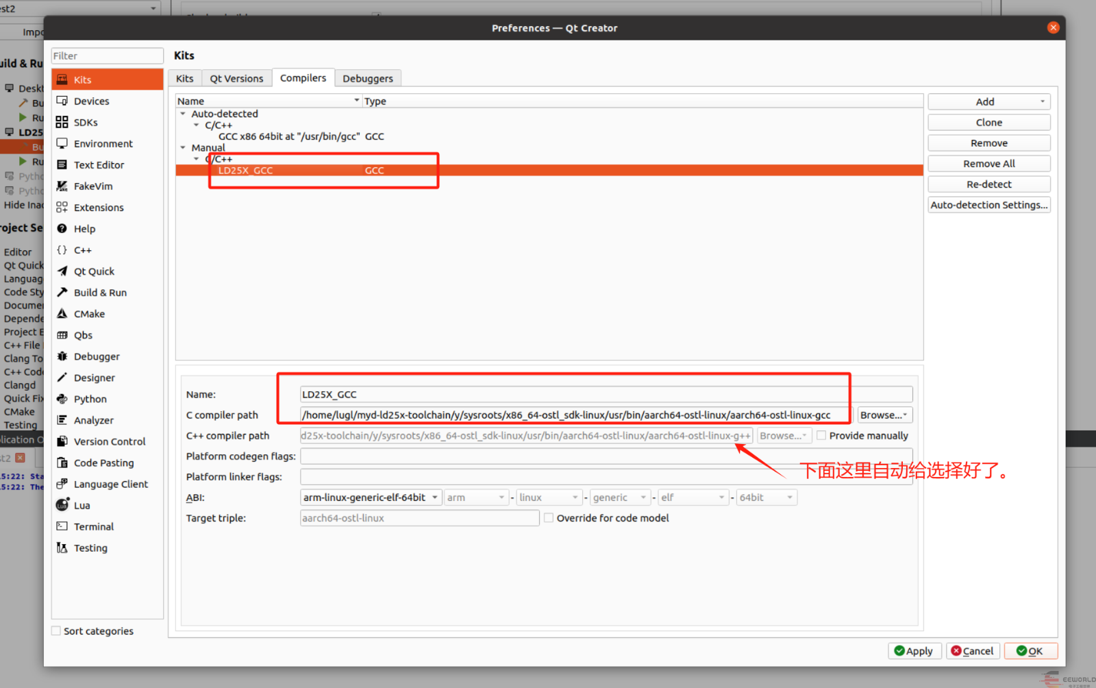 其他的按官方的教程就可以安装了。2、Kit的配置在官方给出的示例中,与这个版本的不一样,首先设置GCC只需要选择gcc就行了,然后g++自动在下面选择: