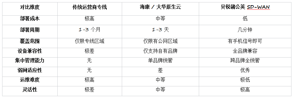 进入 2026 年第二季度,全国春季项目建设进入全面冲刺阶段,连锁零售新店拓张、智慧农业春耕巡检、跨地域工厂安全生产、建筑工地远程监管等场景,集中爆发了远程视频监控系统的部署与升级需求。对于企业而言,监控早已不是简单的 “看个画面”,而是成为了生产管理、安全风控、合规审计的核心数据入口。而组网方案的选择,直接决定了监控系统的可用性、成本和长期价值。目前市场上主流的监控互联方案已形成三足鼎立之势:以运营商 MPLS 专线为代表的传统专网方案、以海康威视 / 大华为代表的安防厂商原生云方案,以及以贝锐蒲公英为代表的 SD-WAN 异地组网方案。本次横评将跳出厂商宣传话术,从部署成本与落地效率、设备兼容与集中管理、复杂网络适应性、后期运维与安全四大核心业务维度,进行客观拆解对比,为不同规模、不同场景的企业提供可落地的选型参考。一、部署成本与落地效率:重资产慢周期 vs 轻量化快部署组网的第一步,就是解决 “能不能快速建起来、花多少钱建起来” 的问题,这也是绝大多数中小企业决策的首要因素。1. 传统运营商专线核心优势:物理链路隔离,网络稳定性和安全性极高,运营商提供标准 SLA 服务承诺,适合对数据传输有极高要求的场景。核心劣势:● 成本高昂:一条跨省专线年费用普遍在数万元至数十万元,点位越多,成本呈线性增长;● 周期漫长:从申请到开通,通常需要 1-3 个月,且需要现场施工布线;● 覆盖受限:在偏远山区、户外工地、临时养殖场等场景,运营商专线往往无法覆盖,或施工成本极高;● 灵活性差:一旦点位搬迁或撤销,已投入的专线成本无法回收,变更流程繁琐。2. 海康 / 大华原生云平台核心优势:与自有硬件深度绑定,即插即用,开通账号即可使用云端存储和远程查看功能,部署门槛极低。核心劣势:● 公网依赖:必须要求每个监控点位有固定公网 IP 或稳定的宽带接入,否则无法正常使用;● 流量成本高:远程查看和云端存储会产生大量上行流量,长期使用的流量费用不可忽视;● 扩容不灵活:随着点位增加,云端服务的订阅费用会大幅上涨,且无法私有化部署。3. 贝锐蒲公英 SD-WAN 异地专网核心优势:● 零公网 IP 依赖:无需申请专线或固定公网 IP,通过云端转发实现设备互联;● 极速部署:硬件即插即用,通过云端控制台几分钟即可完成虚拟局域网搭建,无需专业网络工程师;● 覆盖无死角:支持 4G/5G 移动网络接入,在任何有手机信号的地方都能部署监控;● 成本可控:一次性硬件投入 + 低额年费,成本仅为传统专线的 1/10-1/5,且扩容成本极低。● AI诊断+AI助手:自动组网+问题自查处理,降低组网门槛● 核心劣势:在极致的低延迟要求下(如毫秒级工业控制),性能略逊于物理专线。横评小结:● 传统专线:仅适合预算无上限、点位固定不变的大型金融机构、政府机关总部;● 安防品牌云:适合点位少、设备统一、仅需基础远程查看功能的小微企业;● 蒲公英 SD-WAN:是绝大多数点位分散、需要快速落地、预算有限的中大型企业的最优选择,尤其适合临时项目和下沉市场场景。二、设备兼容与集中管理:生态护城河 vs 统管破壁者几乎没有任何一家企业的监控设备是 “清一色” 的。不同发展阶段采购的不同品牌设备,如何实现统一管理,是企业 IT 部门最头疼的问题之一。1. 传统专线本身只提供网络传输通道,没有任何监控管理能力。企业需要额外采购第三方视频管理平台(VMS),且不同品牌设备的协议对接非常复杂,往往需要定制开发,成本极高。2. 海康 / 大华原生云平台核心优势:与自有品牌摄像头、NVR、硬盘录像机等硬件深度融合,原生支持智能分析、人脸识别、行为检测等高级 AI 功能,体验流畅。核心劣势:生态壁垒极高。如果企业同时拥有海康、大华、宇视、天地伟业等多个品牌的设备,就必须同时登录多套完全独立的后台系统,形成 “监控孤岛”。管理者需要在不同页面之间切换,无法实现统一大屏展示、统一录像回放、统一告警管理,极大降低了工作效率。3. 贝锐蒲公英视频统管平台核心优势:● 全品牌兼容:打破底层协议限制,支持接入市面上 99% 以上的主流安防品牌设备,无需更换原有硬件;● 一站式统管:在一个控制台内,即可实现跨地域、跨品牌所有监控点位的实时预览、录像回放、云台控制、告警管理;● 统一大屏:支持自定义视频墙布局,在总部监控中心一面大屏展示所有分支的实时画面,一目了然。● 核心劣势:原生 AI 分析能力(如精准人脸识别)略逊于海康、大华等专业安防厂商,但可通过对接第三方 AI 平台进行补充。横评小结:● 如果企业是全新建设,且承诺未来 100% 只采购单一品牌设备,安防厂商原生云是不错的选择;● 但对于 90% 以上存在 “历史遗留设备”、或需要通过招投标引入多品牌设备的企业而言,蒲公英的跨品牌统管能力,是解决 “监控孤岛” 问题的唯一务实方案。三、复杂网络适应性:靠天吃饭 vs 主动优化视频监控对上行带宽和网络稳定性要求极高。“关键时刻画面卡顿、掉线”,是所有监控系统最致命的问题。1. 传统专线在有专线覆盖的区域,网络稳定性极佳,丢包率极低。但一旦离开专线覆盖范围,就完全无能为力。2. 安防品牌云在城市中心、网络基建完善的区域表现尚可。但一旦下沉到乡镇、偏远厂区、矿山、工地等网络环境复杂的区域,就会出现严重的卡顿、花